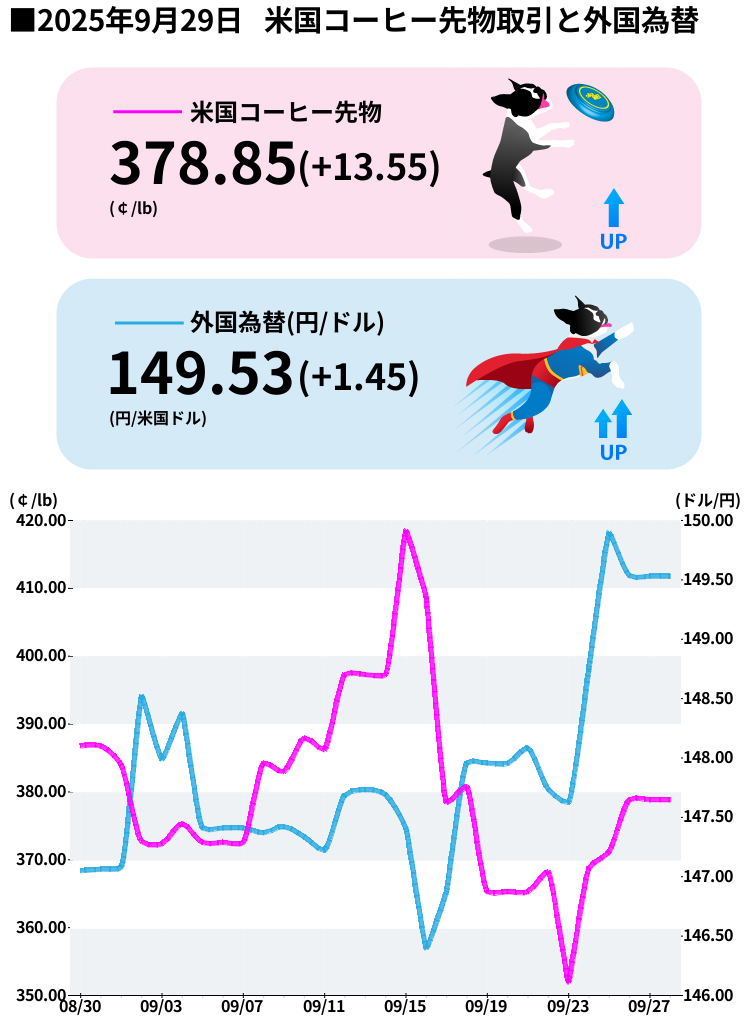 Ahora, ¡echemos un vistazo a mis propias predicciones para el mercado la próxima semana y más allá! Escenario alcista (meneo de cola): si la lluvia esperada en Brasil no cae lo suficiente o si los inventarios de ICE continúan disminuyendo, es probable que los precios reanuden una tendencia alcista. Incluso podrían moverse hacia el pico de fin de año de 424 centavos/lb, registrado el 16 de septiembre . En particular, si las señales de un fenómeno de La Niña se fortalecen, podrían entrar compras especulativas y los precios podrían moverse en un rango de 390-410 centavos/lb . Escenario bajista (orejas planas): por otro lado, si la lluvia continúa cayendo suavemente en Brasil y la producción en Vietnam se recupera, las preocupaciones sobre el suministro podrían disminuir y los precios podrían entrar en una fase de corrección. Además, si EE. UU. alivia o exime los aranceles, el sentimiento del mercado podría mejorar drásticamente. En ese caso, podemos esperar que los precios se muevan en un rango de 360-375 centavos/lb . Técnicamente , el máximo de la semana pasada de 378,85 probablemente actúe como resistencia a corto plazo. Una ruptura por encima de este nivel indicaría una tendencia alcista, mientras que una ruptura por debajo indicaría una corrección. ¡Es probable que la línea de soporte se establezca alrededor de 368,25! En cuanto al mercado cambiario, a menos que se produzcan cambios importantes en la postura de política monetaria de Japón y EE. UU., es probable que se mantenga estable en el rango de 146-150 yenes . Sin embargo, si hay algún indicador económico o anuncio de política monetaria sorprendente, es posible que se produzcan fluctuaciones repentinas, por lo que debemos permanecer atentos. En general, esta semana puede haber sido la "calma antes de la tormenta". A medida que entramos en octubre, los patrones climáticos de Brasil se aclararán y los pronósticos de cosecha deberían ser más precisos. Podría haber otro movimiento importante allí, así que tendremos que estar muy atentos. *Invierta bajo su propio riesgo, así que tenga cuidado y manténgase alerta.