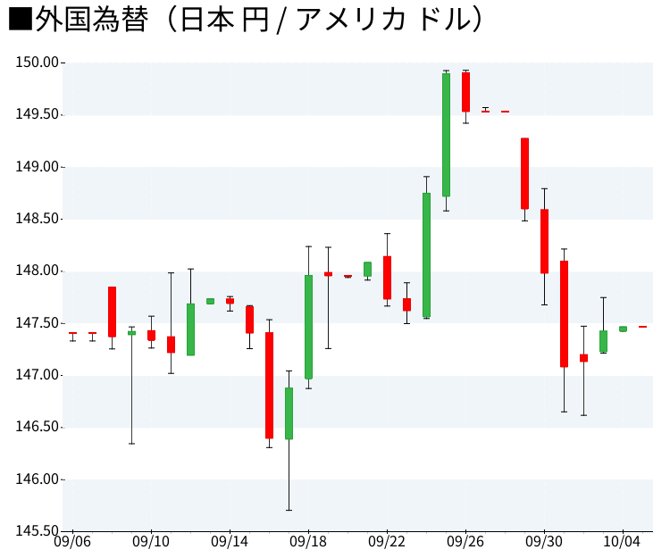 El tipo de cambio USD/JPY fluctuó esta semana entre 147 y 148 yenes . El precio de cierre del 30 de septiembre fue de 147,93 yenes . En septiembre, el tipo de cambio se mantuvo relativamente estable, subiendo solo un 0,52% , de 147,17 yenes a principios de mes a 147,93 yenes a finales.