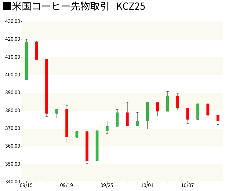 El lunes 6 de octubre comenzó la semana, con un mercado agitado, comenzando en el rango de los $385. Se esperaba que el precio subiera aún más debido al impacto de la sequía en Brasil y al arancel del 50% impuesto por EE. UU. Sin embargo, del martes 7 al miércoles 8 de octubre, el precio disminuyó gradualmente, hasta llegar a los $375,40 el 8 de octubre . Esto representó una caída del -1,55% , y se dice que la presión de compra disminuyó temporalmente debido a los rumores en el mercado de que las negociaciones arancelarias entre Brasil y EE. UU. podrían estar avanzando.