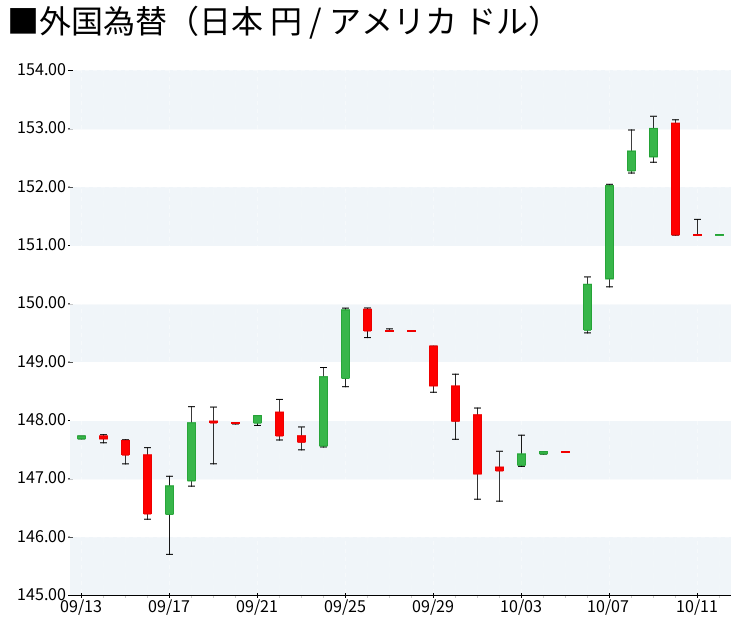 En el mercado cambiario esta semana, el USD/JPY fluctuó entre 150 y 153 yenes . Al 6 de octubre, un dólar rondaba los 150,28 yenes , pero a mediados de la semana subió hasta los 153 yenes . Esto se debe a un ligero fortalecimiento del dólar y un debilitamiento del yen.