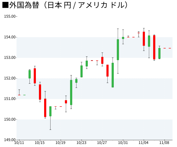 Después de alcanzar un máximo semanal de 154,335 yenes el 4 de noviembre, el yen cayó a un mínimo semanal de 152,965 yenes el 7 de noviembre.