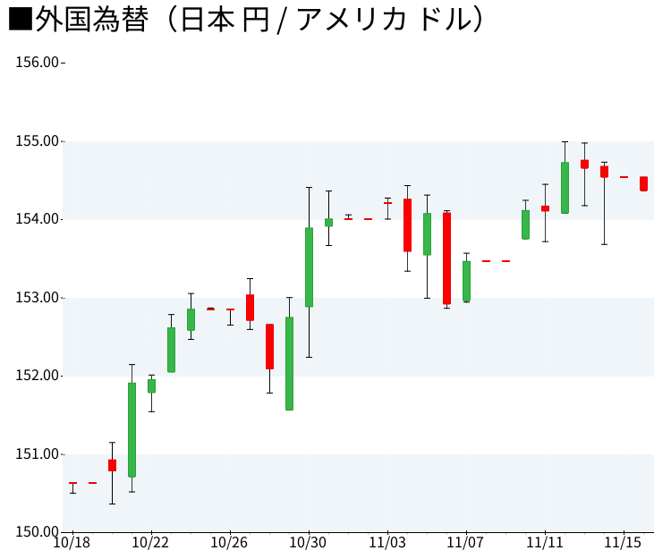 11月10日(月)には154.127円で推移し、11月11日(火)には週の安値153.78円まで下落したネ。