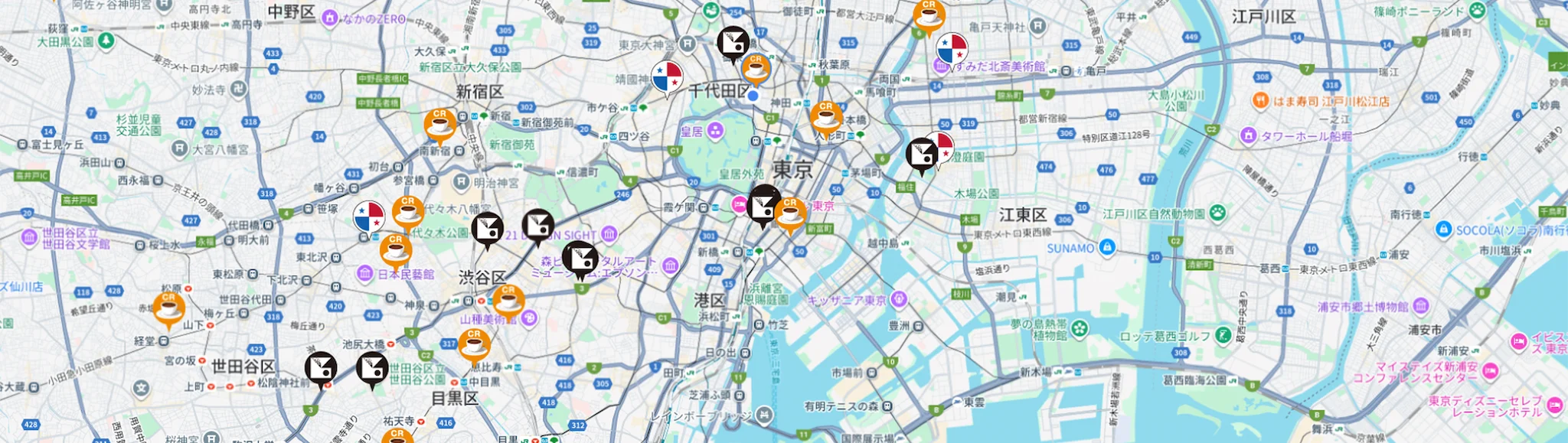 コーヒーが飲める店、パナマ生豆を取り扱う店、焙煎士の店など、